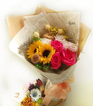 乾燥花-(滿天星.千日紅.棉花.麥桿菊.紫霞草 因為是乾燥花會有一點掉落狀況實屬正常喔!). 香皂花-(玫瑰花.向日葵)香皂花是用香皂製作的有淡淡的香味喔! (^▽^)♪