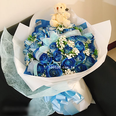 33朵藍玫瑰花束+1隻小熊