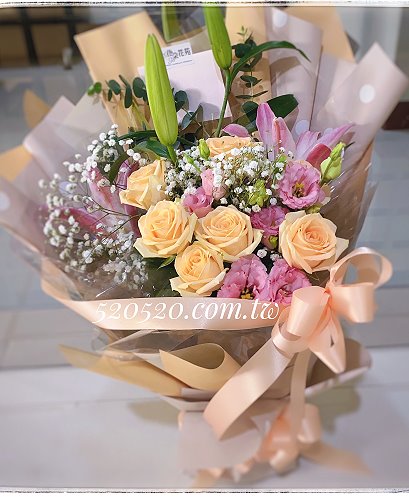 9朵香檳6朵百合搭配桔梗.滿天星*如欲香檳玫瑰缺貨會以粉玫瑰替代