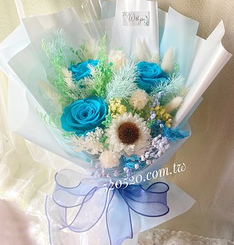 3朵藍色永生玫瑰花(6公分)搭配索拉花及永生乾燥花束 **如遇照片上索拉花及永生花材缺貨將以其他花材替代 *特殊需求及任何問題歡迎賴詢問 ID:520520.flower
