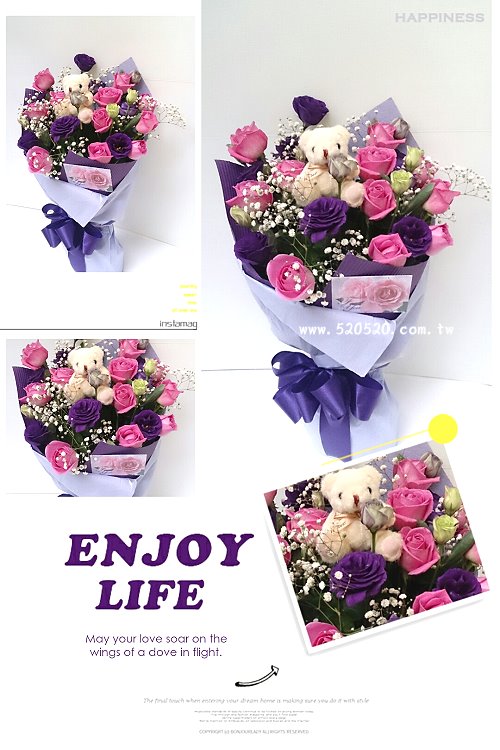 11朵紫玫瑰花+紫桔梗+1隻小熊(小熊顏色以實際出貨為主)