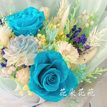 2朵藍色永生玫瑰花(6公分)搭配索拉花及永生乾燥花束 **如遇照片上索拉花及永生花材缺貨將以其他花材替代 *特殊需求及任何問題歡迎賴詢問 ID:520520.flower