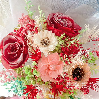 2朵紅色金箔永生玫瑰花(6公分)搭配索拉花及永生乾燥花束 **如遇照片上索拉花及永生花材缺貨將以其他花材替代 *特殊需求及任何問題歡迎賴詢問 ID:520520.flower