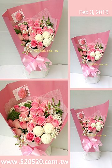 15朵粉玫瑰+乒乓菊+水仙百合花束