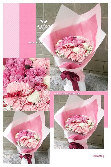 50朵粉中康乃馨+10朵紫玫瑰+5顆乒乓菊+深山櫻